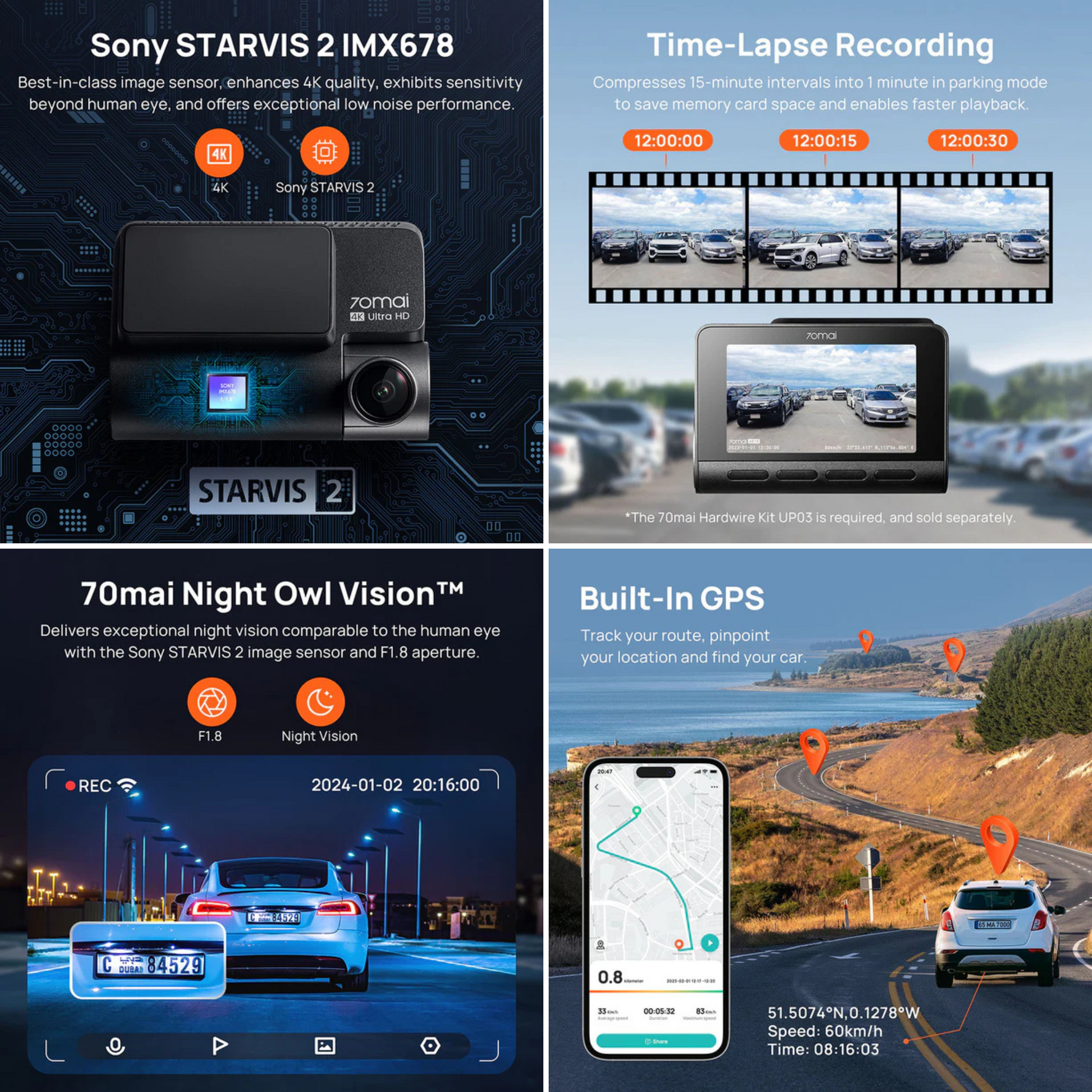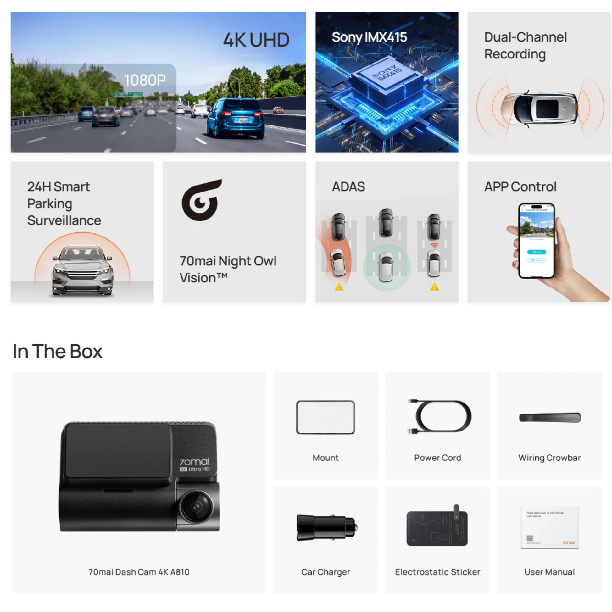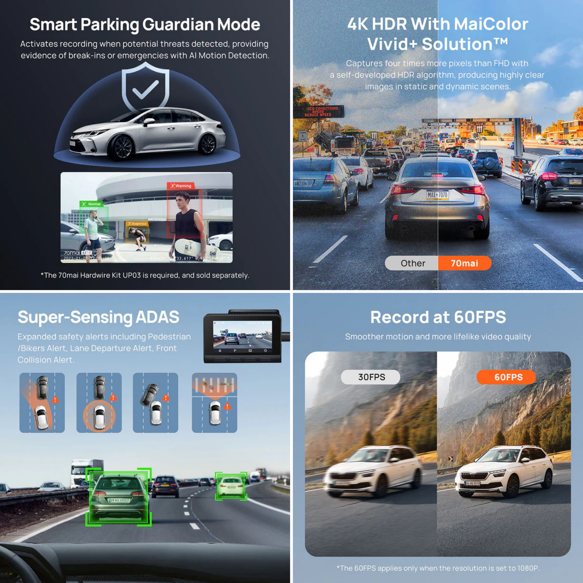 Supported Functions | - 70mai Night Owl Vision™ - MaiColor Vivid+ Solution™️ - Smart Parking Guardian Mode - AI Motion/Collision Detection - Loop Recording - Emergency Recording - Time-Lapse Recording - Share Video - Route Tracking - APP Control - Built-in GPS - ADAS - G Sensor - HDR - 3DNR - Shoot Photo |