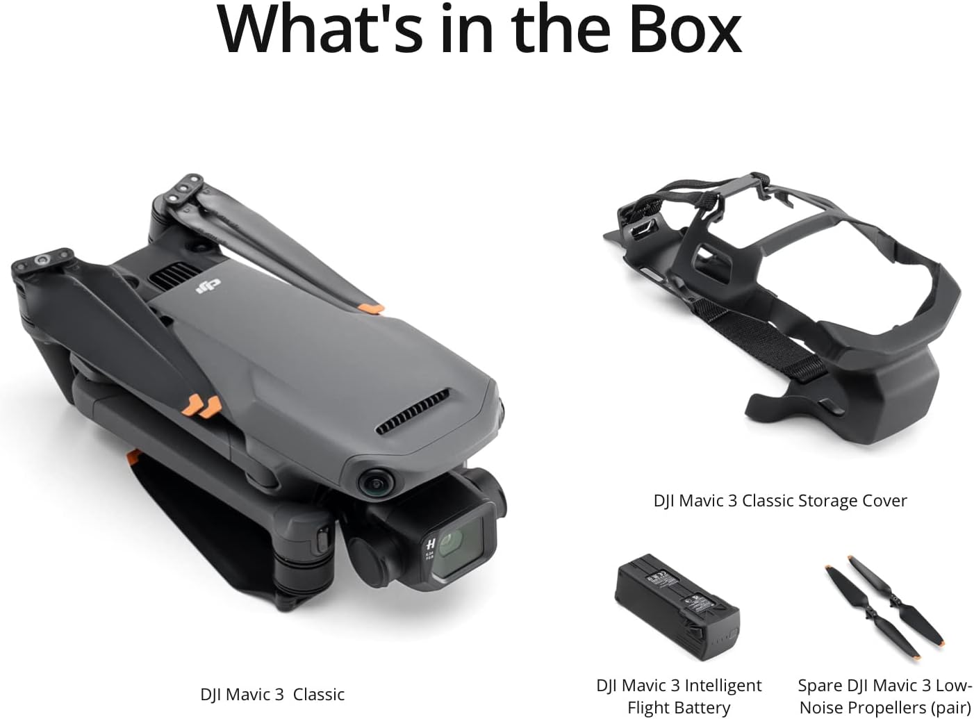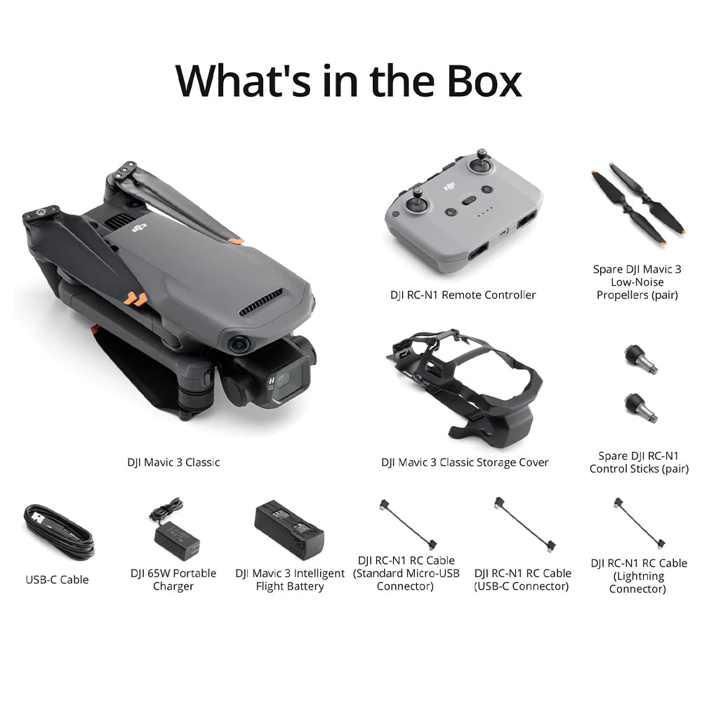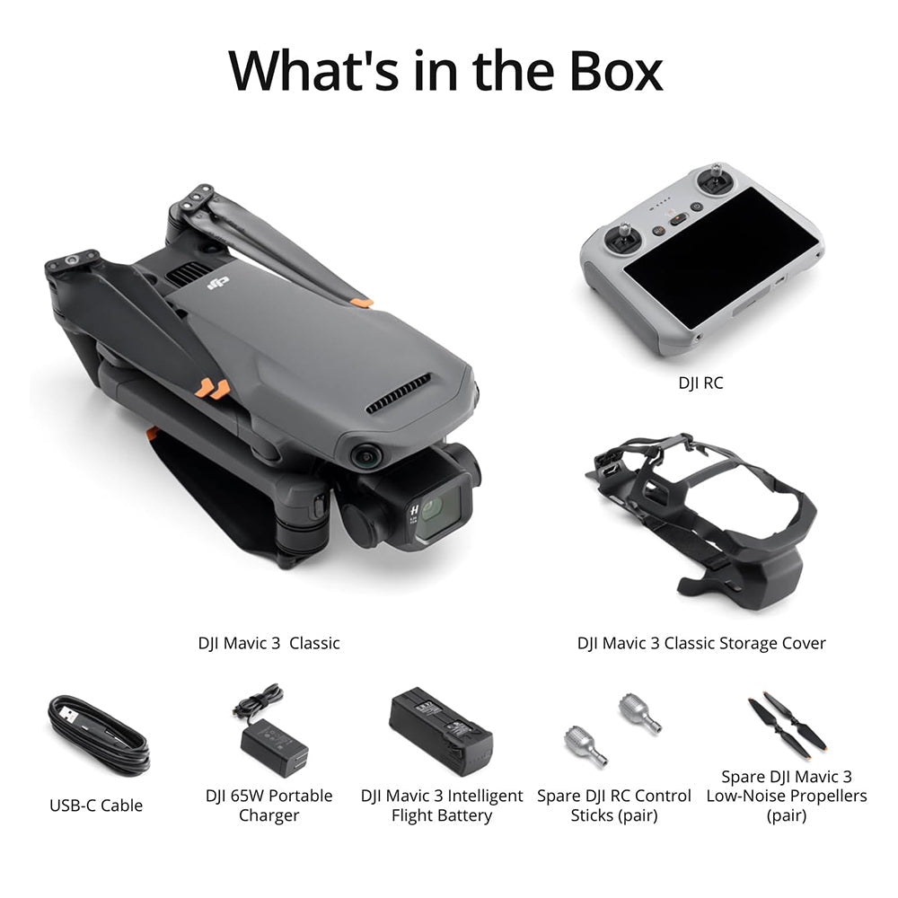 Included Components | DJI Mavic 3 Classic Storage Cover x1, DJI RC x1, DJI Mavic 3 Low-Noise Propellers (pair) x3, DJI Mavic 3 Classic x1, DJI 65W Portable Charger x1, DJI Mavic 3 Intelligent Flight Battery x1, Spare DJI RC Control Sticks (pair) x1, USB-C Cable x1 |