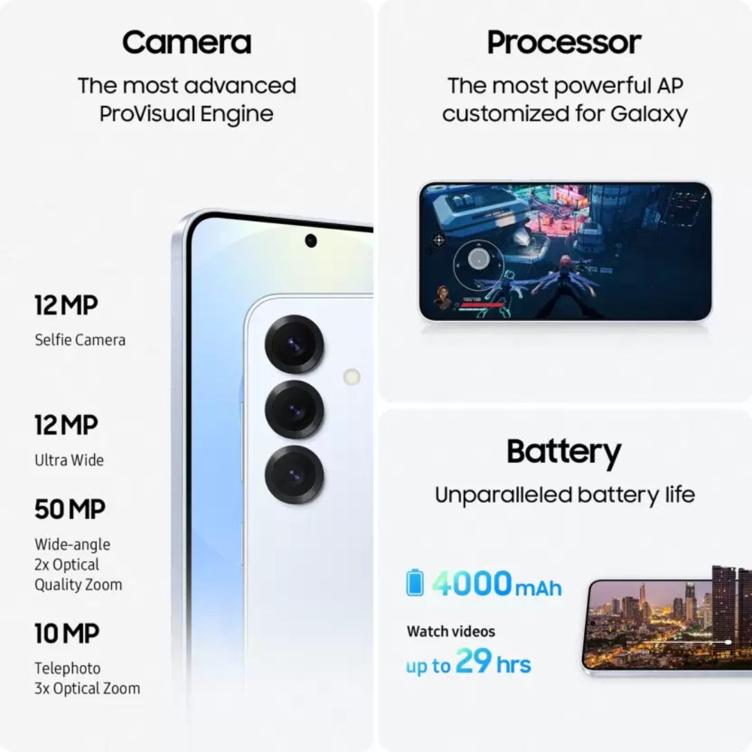 The Samsung Galaxy S25 features a 6.2" Dynamic AMOLED 120Hz display , powered by the Snapdragon 8 Elite with 12GB RAM and up to 512GB storage . It has a 50MP triple-camera setup , a 12MP front camera , and a 4000mAh battery with fast & wireless charging . Running Android 15 (One UI 7) , it includes IP68 water resistance, an in-display fingerprint sensor, Wi-Fi 7, and UWB support .