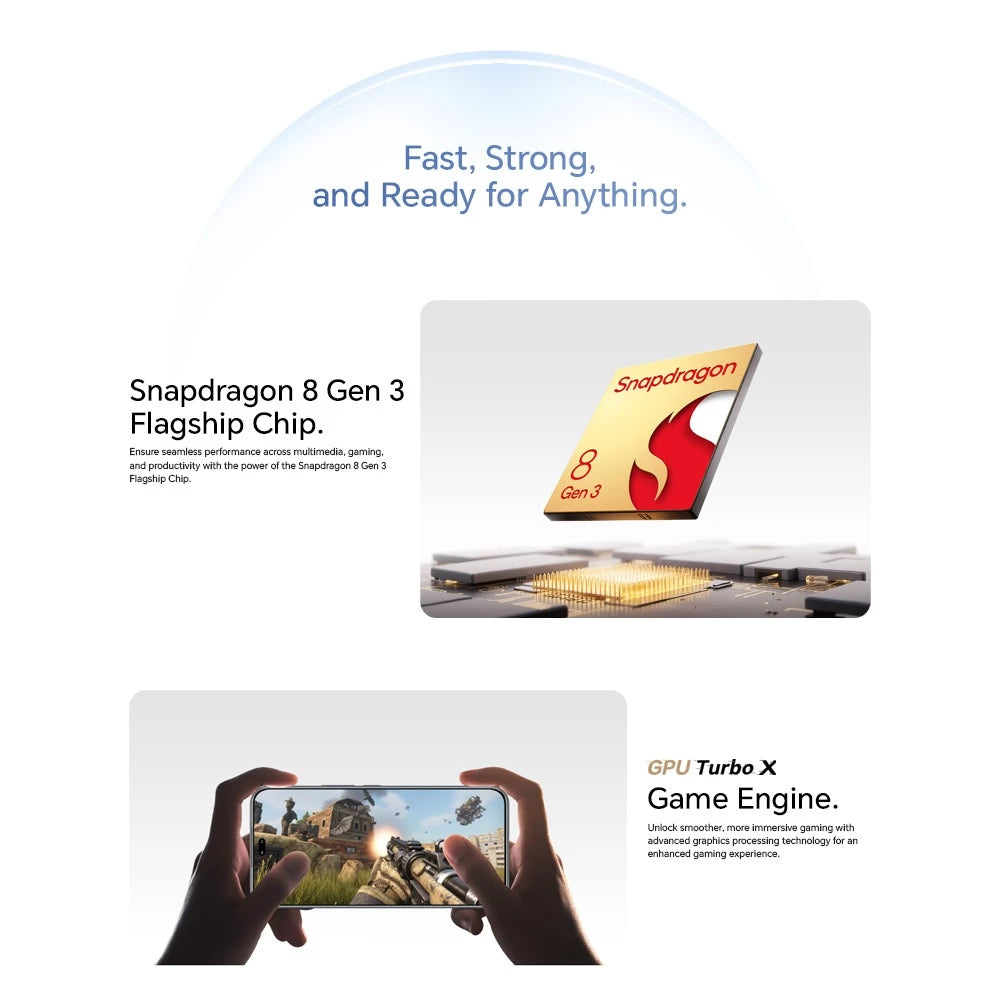 Processor (SoC) | Qualcomm Snapdragon 8 Gen 3 (4 nm); 14-core CPU (1×3.0 GHz + 5×2.95 GHz + 2×2.0 GHz), Adreno 750 GPU |