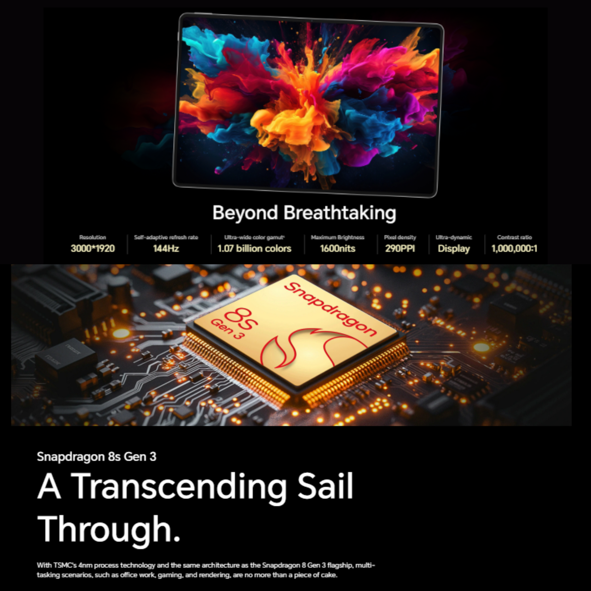 Type: OLED, 1B colors, 144Hz, IMAX Enhanced, HDR10, 1600 nits (peak) Size: 12.3 inches (~89.4% screen-to-body ratio) Resolution: 1920 x 3000 pixels (~290 ppi density) |