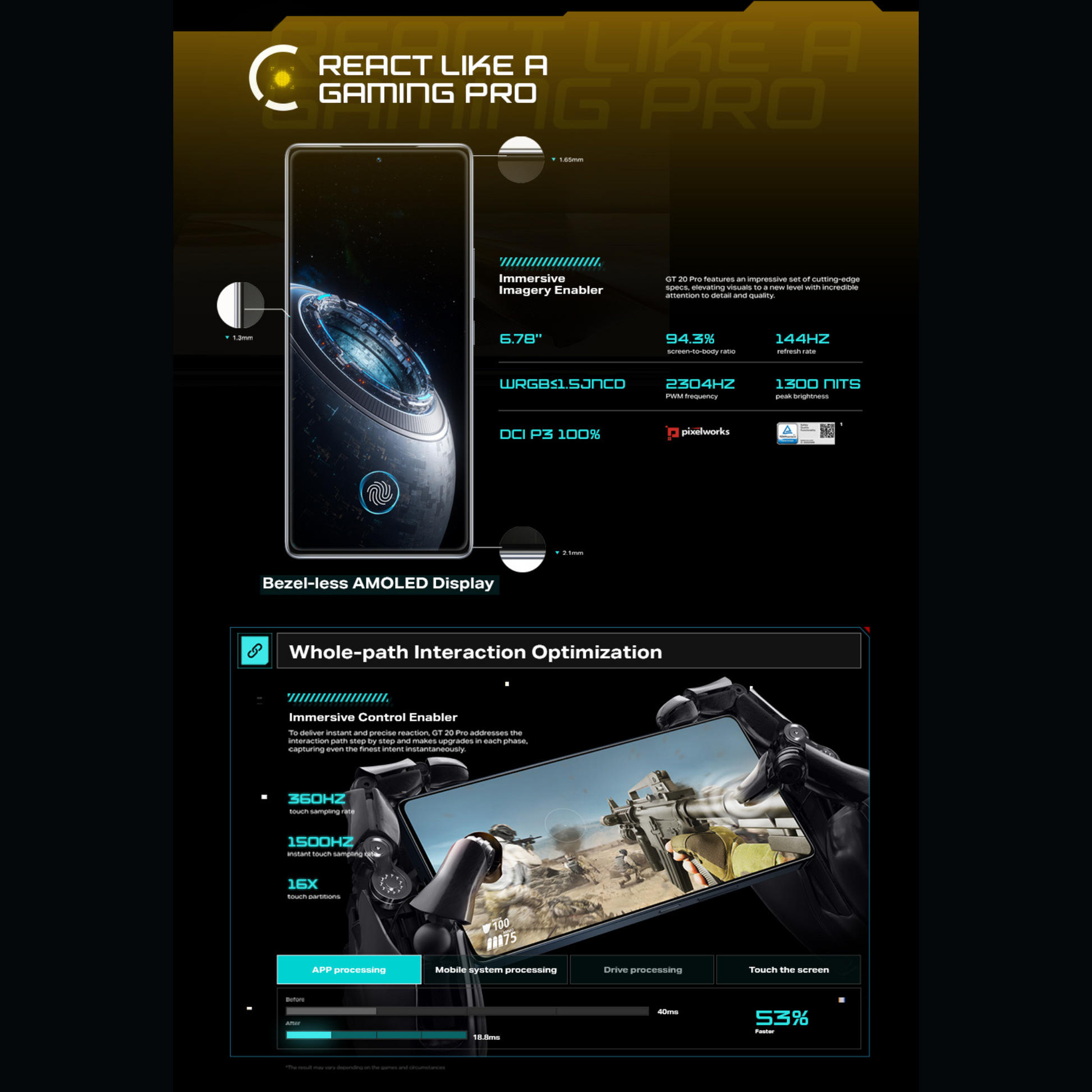 Display | 6.78" AMOLED, 144Hz refresh rate, 1080 x 2436 FHD+ resolution, 388 PPI, 1300 nits peak brightness |