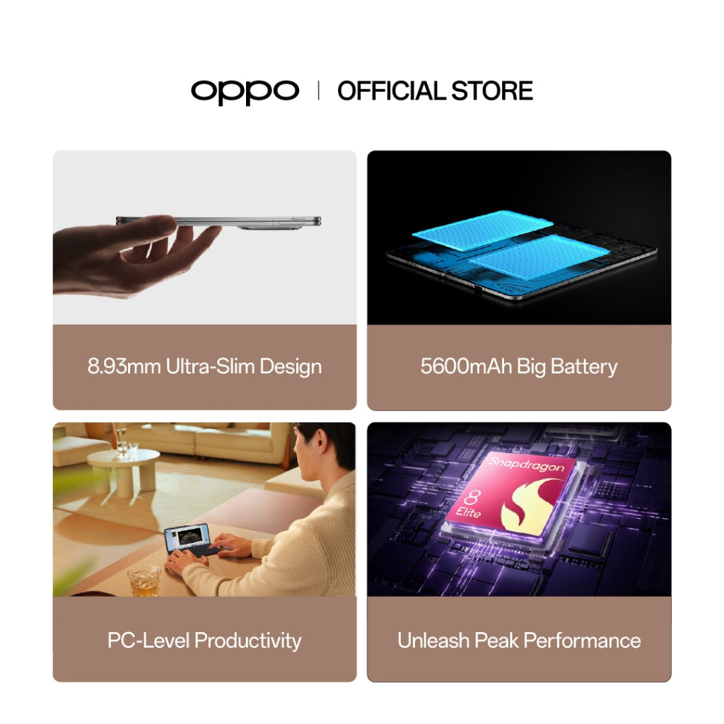 Productivity & Extras | Stylus support, boundless view multitasking (3 apps split-screen), OPPO AI, hardware SP chip for security; side fingerprint sensor |