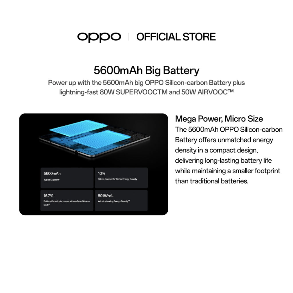 Battery & Charging | 5,600 mAh dual-cell SiC; 80 W wired (SuperVOOC) + 50 W wireless (AirVOOC); ~full charge in 50 min; reverse charging supported |