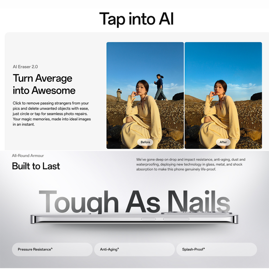 AI Features | AI Eraser 2.0, AI Clear Face, AI Studio (photo enhancements and generative features), AI Toolbox (AI Writer, Speak, Summary, and Recording Summary) |