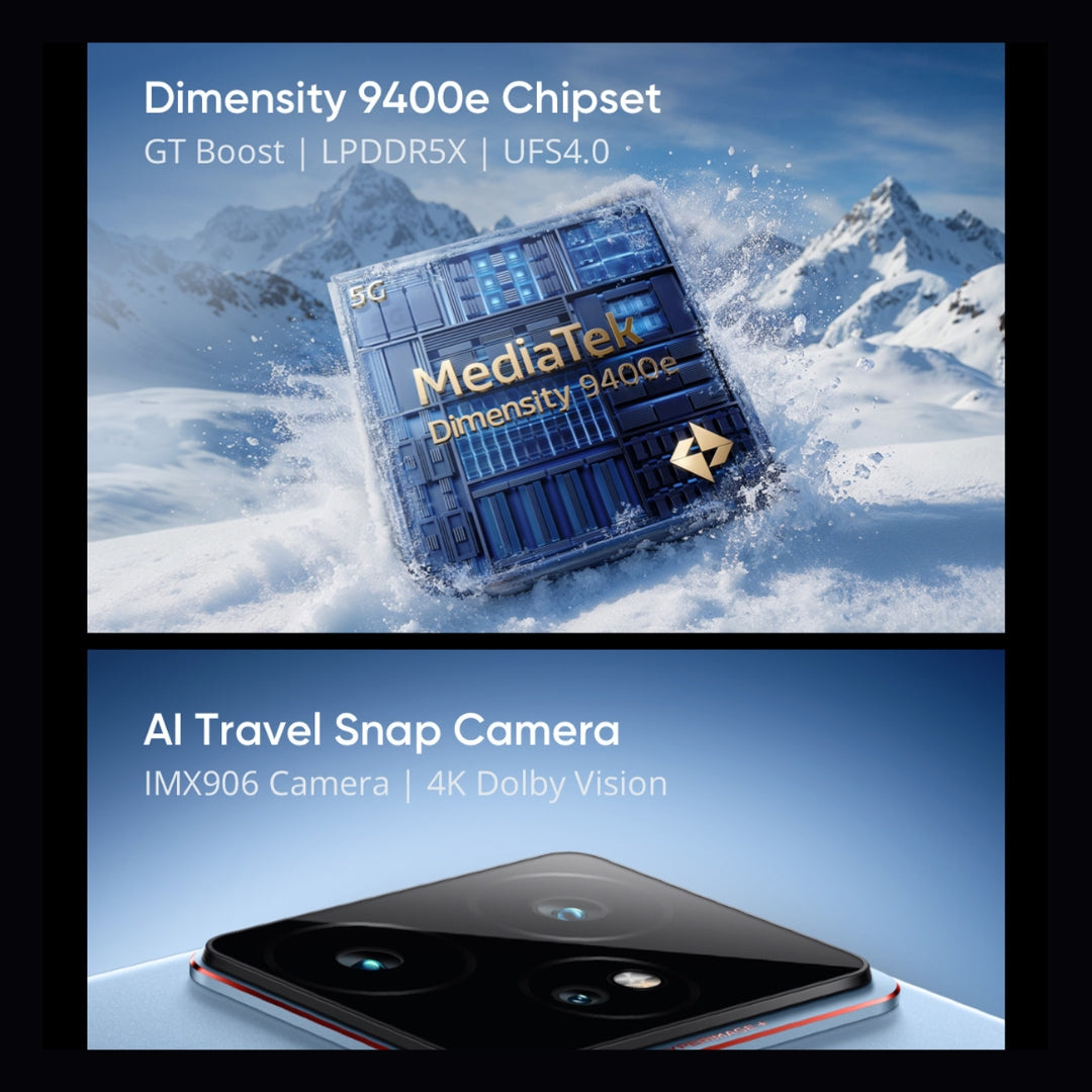 Platform (SoC) | MediaTek Dimensity 9400e (4 nm); CPU octa-core up to 3.4 GHz; Arm Immortalis‑G720 MC12 GPU (Realme) |