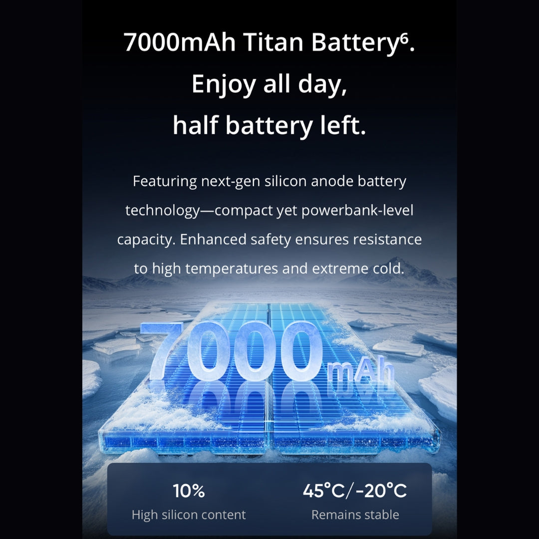 Battery & Charging | 7,000 mAh typical (6,850 mAh minimum); 120 W wired charge (50% in ~14 min, full in ~40 min); 7.5 W reverse charging; TÜV Rheinland 5‑star battery certified |