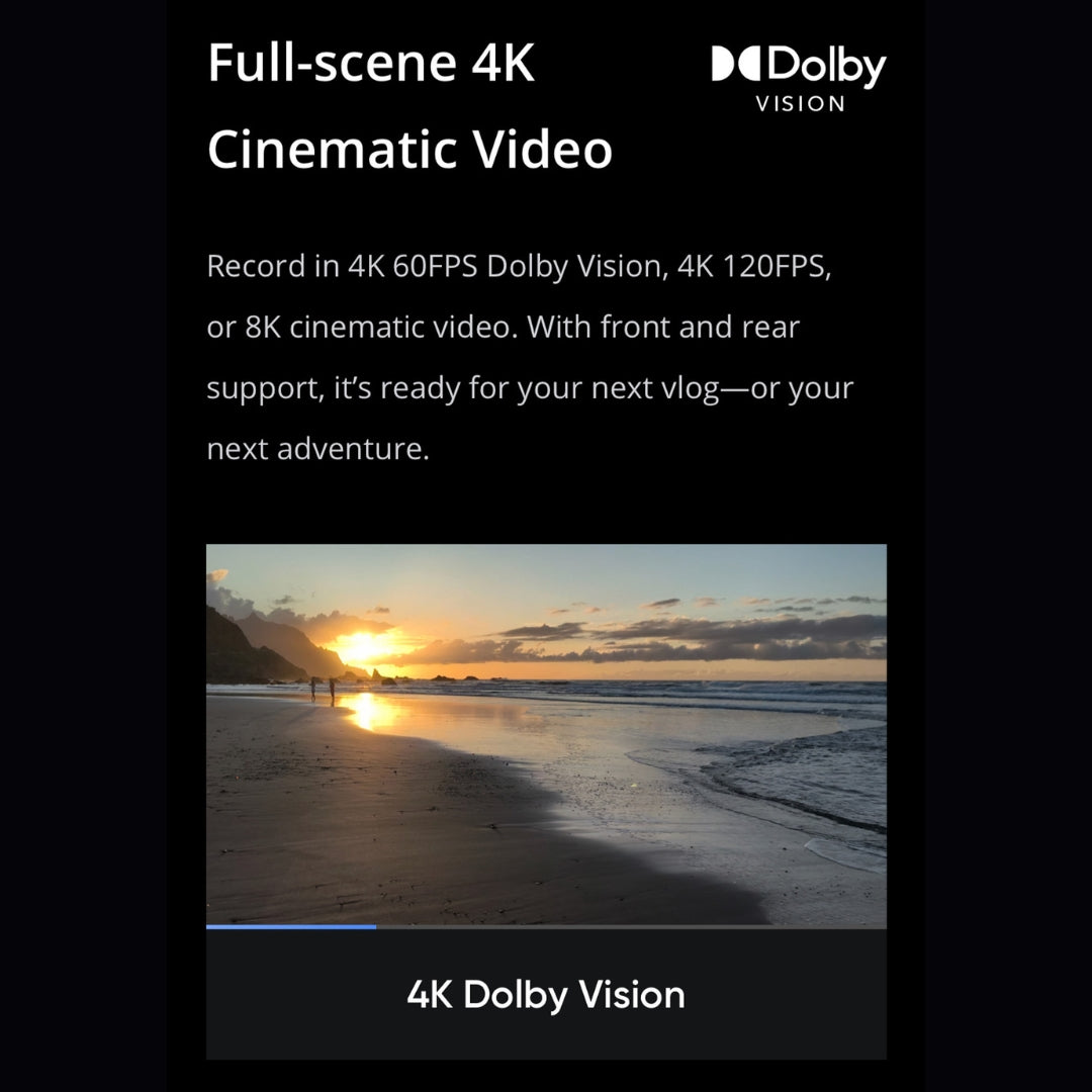 Video Recording | Rear: 8K@30, 4K@120/60, Dolby Vision; Front: 4K@60/30 |
