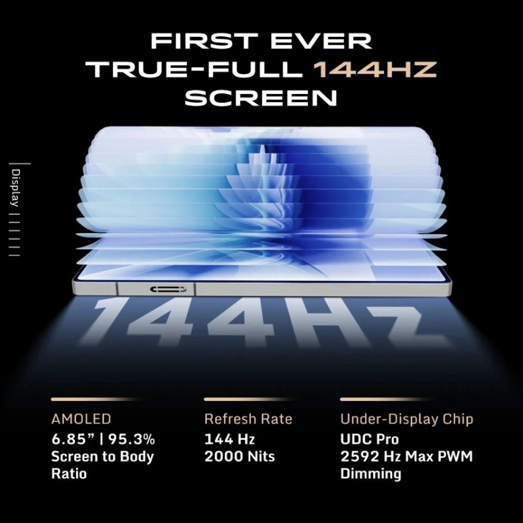 Display | 6.85″ BOE Q9+ AMOLED, 2688×1216 px (~431 ppi), 144 Hz refresh, 2500 Hz touch sampling (avg 960 Hz), 2000 nits peak, Gorilla Glass |