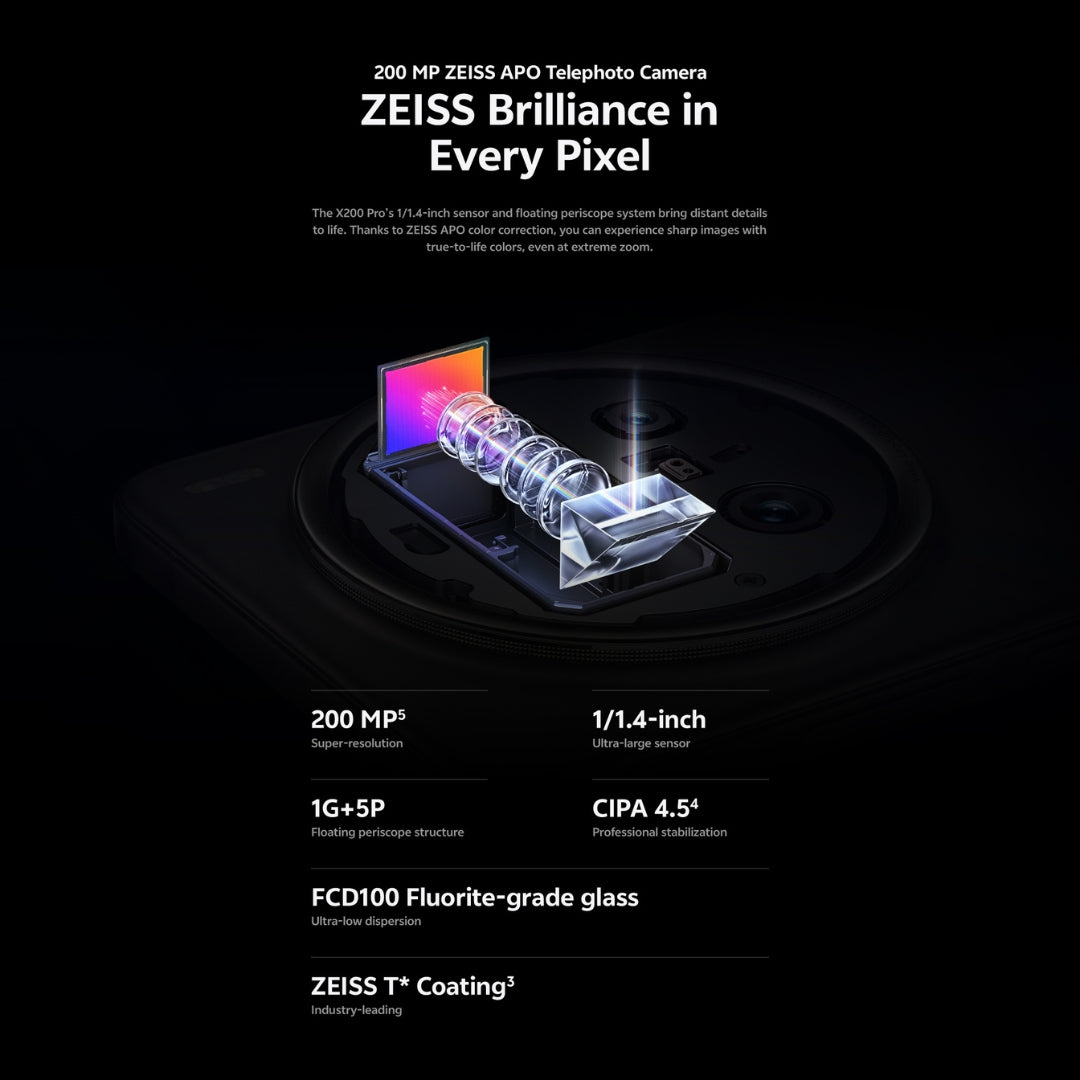 Rear Camera System | • 200 MP ZEISS APO Telephoto: HP9 sensor, 1/1.4″, f/2.67, 85 mm equiv., 3.7× optical zoom, CIPA 4.5 stops, OIS • 50 MP ZEISS True Color Main: 1/1.28″, f/1.57, OIS (Vivo)• 50 MP Ultra-Wide: 1/2.76″, f/2.0, autofocus (Vivo) |